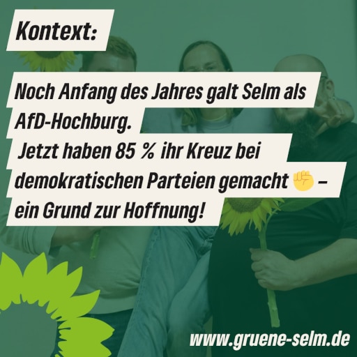 Noch Anfang des Jahres hieß es oft, Selm sei eine AfD-Hochburg. Doch die Wahl hat gezeigt: 85 % der Wählerinnen und Wähler haben für demokratische Parteien gestimmt, ein starkes Zeichen für unsere Stadt und ein guter Grund zur Hoffnung!